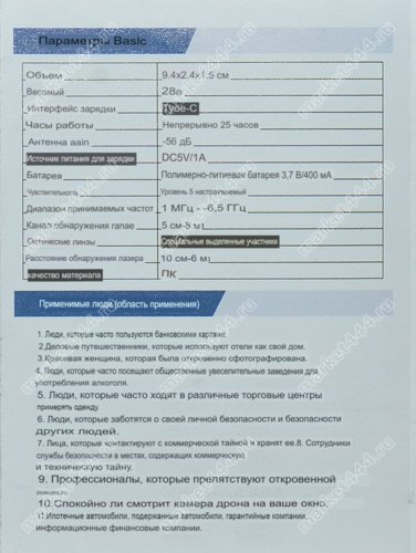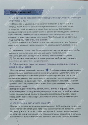 Режимы работы: 1) Поиск источников э/м излучения - сигналов от WIFI, GMS скрытых шпионских мини видео камер, прослушки; радио микрофонов, жучков маяков, УКВ радиостанций, передачи данных на сервер от GPS трекеров. 2) Поиск источников магнитного поля GPS трекеров слежения. 3 Визуальный поиск шпионских скрытых видео камер по отблескам линз микрообъективов.